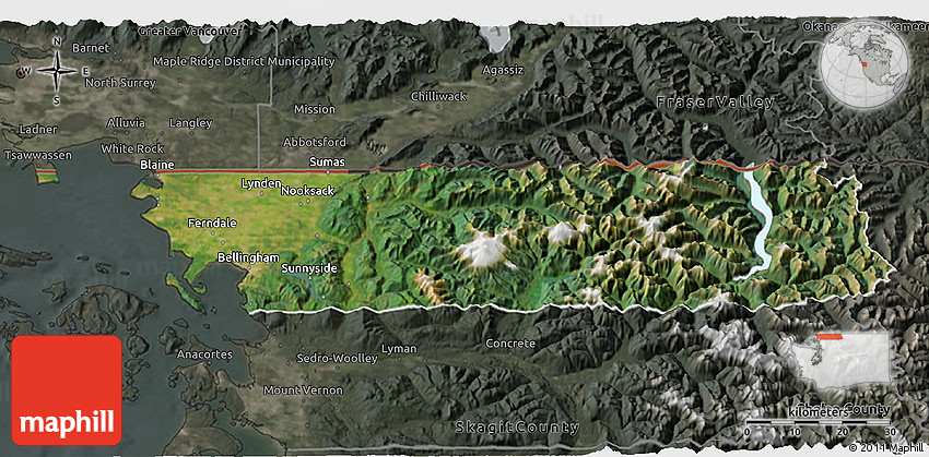 The 3D satellite map represents one of several map types and styles available. Look at Whatcom County, Washington, United States from different perspectives.