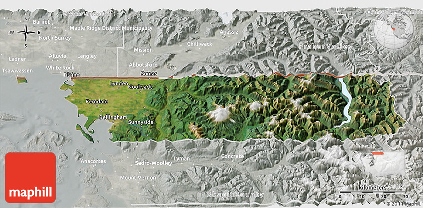 The 3D satellite map represents one of several map types and styles available. Look at Whatcom County, Washington, United States from different perspectives.