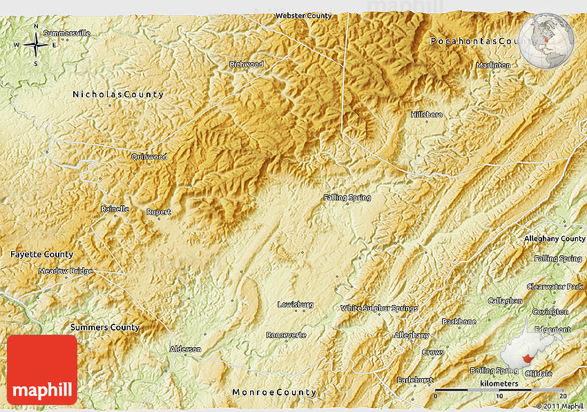 The 3D physical map represents one of several map types and styles available. Look at Greenbrier County, West Virginia, United States from different perspectives.