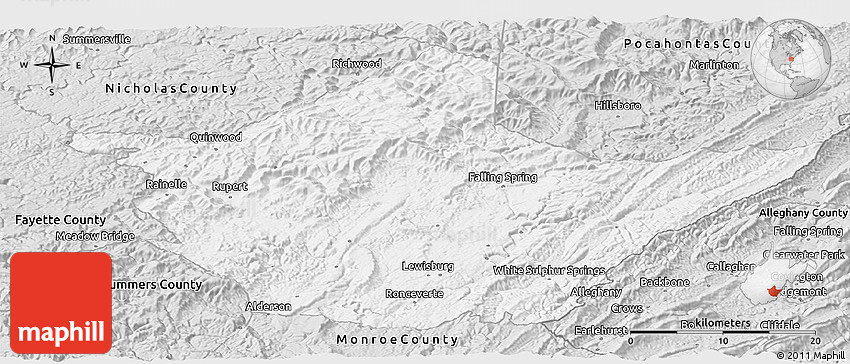The panoramic silver style map represents one of several map types and styles available. Look at Greenbrier County, West Virginia, United States from different perspectives.