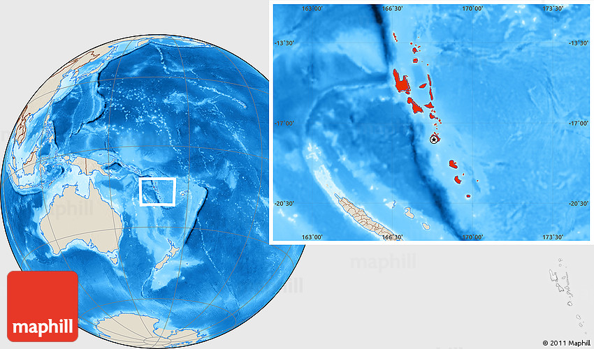 Maphill is a collection of map images. This image combines a shaded relief map with the globe centered on Vanuatu. Use the buttons under the image to switch to different map types.