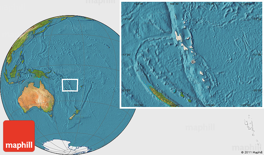 Maphill is a collection of map images. This image combines a shaded relief map with the globe centered on Vanuatu. Use the buttons under the image to switch to different map types.