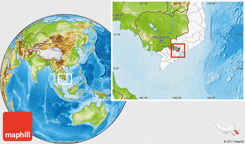 Maphill is a collection of map images. This image combines a physical map with the globe centered on Can Duoc. Use the buttons under the image to switch to different map types.