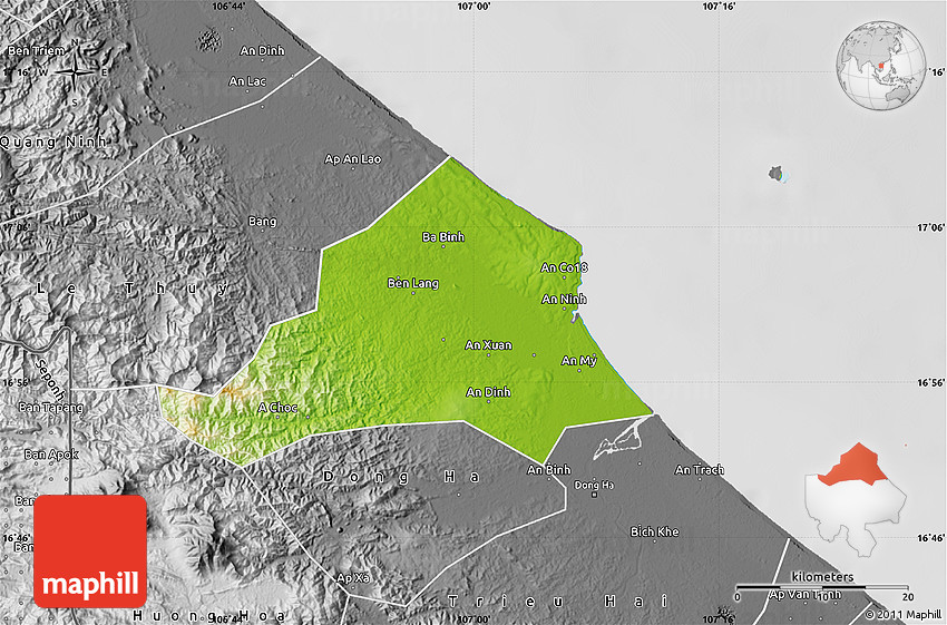 The flat physical map represents one of several map types and styles available. Look at Ben Hai, Quang Tri, Vietnam from different perspectives.
