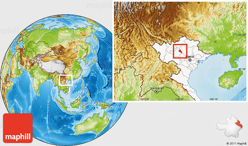 Maphill is a collection of map images. This image combines a physical map with the globe centered on Yen Binh. Use the buttons under the image to switch to different map types.