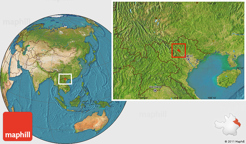 Maphill is a collection of map images. This image combines a satellite map with the globe centered on Yen Binh. Use the buttons under the image to switch to different map types.