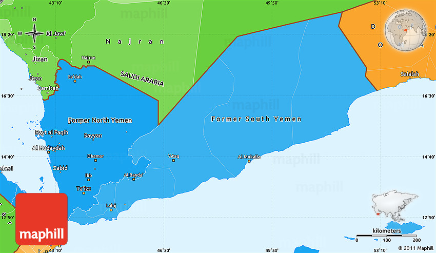 The simple political shades map represents one of many map types and styles available. Look at Yemen from different perspectives.