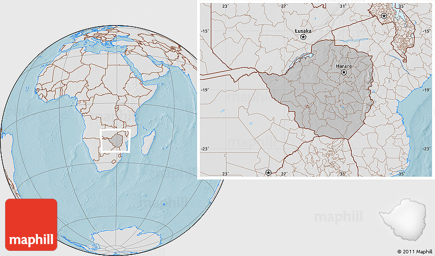Maphill is a collection of map images. This image combines a gray map with the globe centered on Zimbabwe. Use the buttons under the image to switch to different map types.