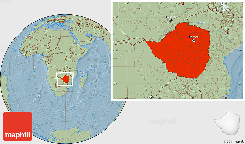 Maphill is a collection of map images. This image combines a savanna style map with the globe centered on Zimbabwe. Use the buttons under the image to switch to different map types.