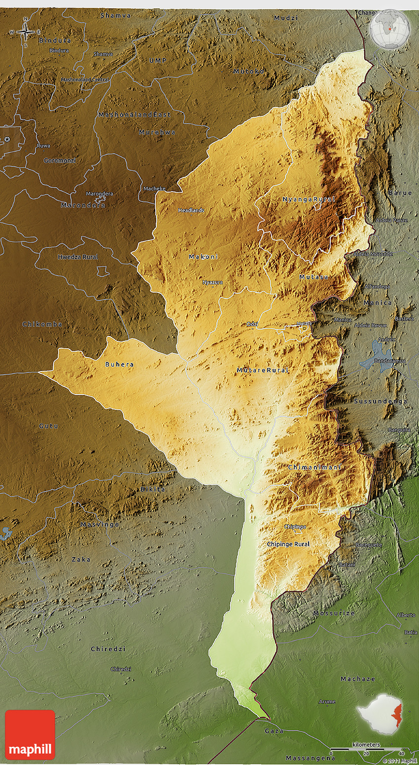 The 3D physical map represents one of many map types and styles available. Look at Manicaland from different perspectives.
