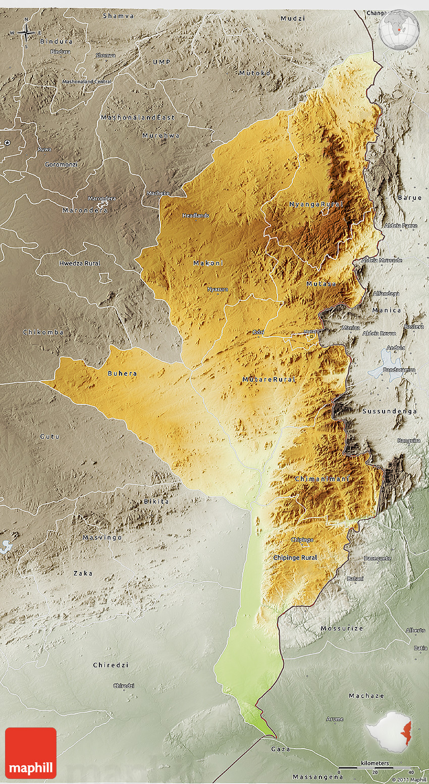 The 3D physical map represents one of many map types and styles available. Look at Manicaland from different perspectives.