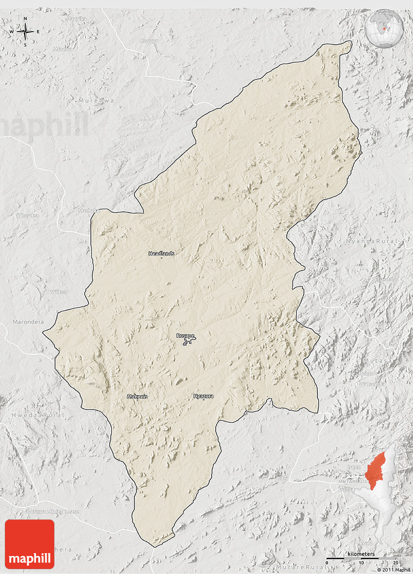 Shaded relief map shows landscape features, such as mountains, valleys and plateaus. Flat areas are smooth on the map, areas with steep slopes and mountains appear more rough. The above map of Makoni was created using a digital elevation model.
