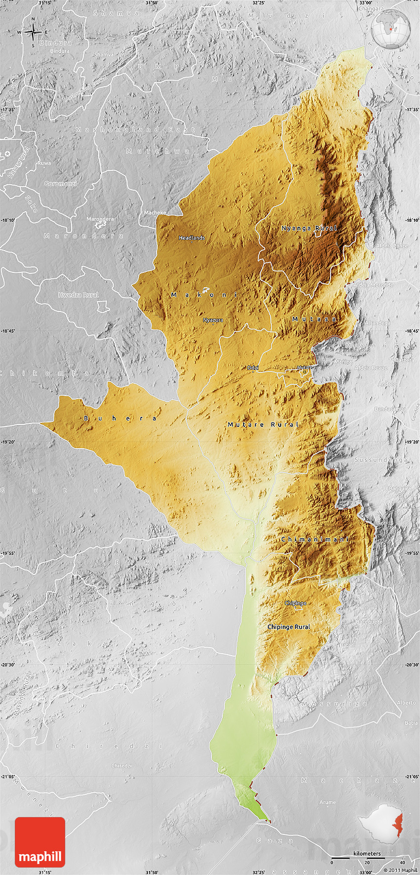 Physical map illustrates the mountains, lowlands, oceans, lakes and rivers and other physical landscape features of Manicaland. Differences in land elevations relative to the sea level are represented by color.