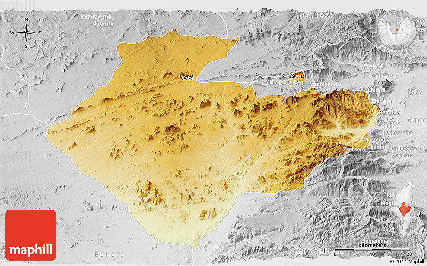 The panoramic physical map represents one of several map types and styles available. Look at Mutare Rural, Manicaland, Zimbabwe from different perspectives.