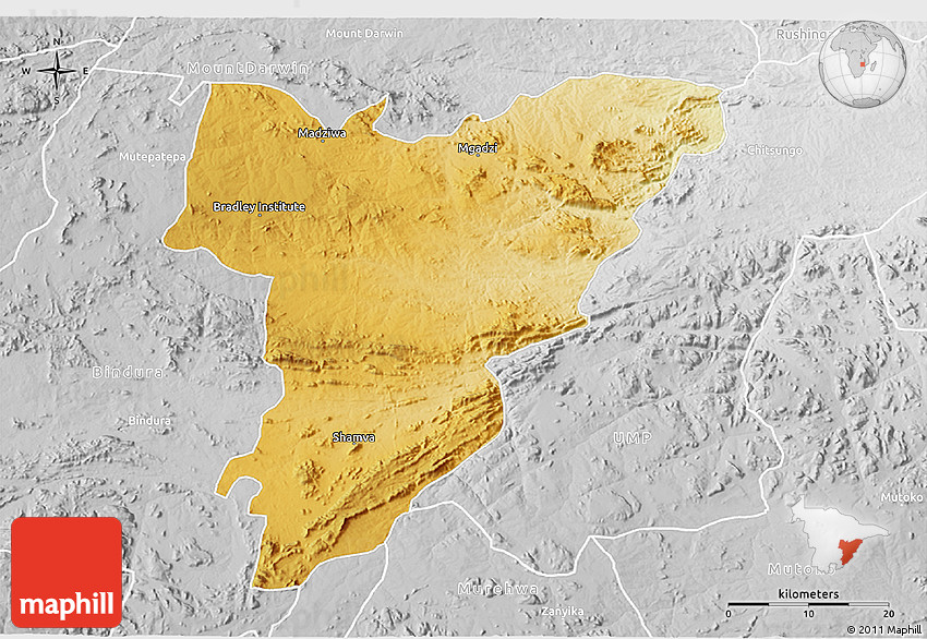 Physical map illustrates the mountains, lowlands, oceans, lakes and rivers and other physical landscape features of Shamva. Differences in land elevations relative to the sea level are represented by color.