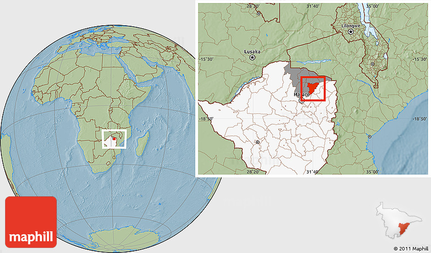 Maphill is a collection of map images. This image combines a savanna style map with the globe centered on Shamva. Use the buttons under the image to switch to different map types.