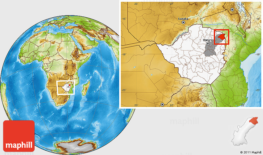 Maphill is a collection of map images. This image combines a physical map with the globe centered on Mudzi. Use the buttons under the image to switch to different map types.