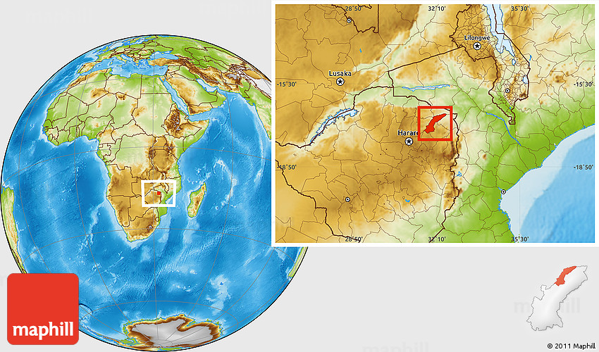 Maphill is a collection of map images. This image combines a physical map with the globe centered on UMP. Use the buttons under the image to switch to different map types.