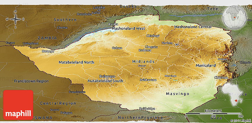 The panoramic physical map represents one of many map types and styles available. Look at Zimbabwe from different perspectives.