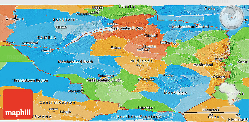 The panoramic political map represents one of many map types and styles available. Look at Zimbabwe from different perspectives.